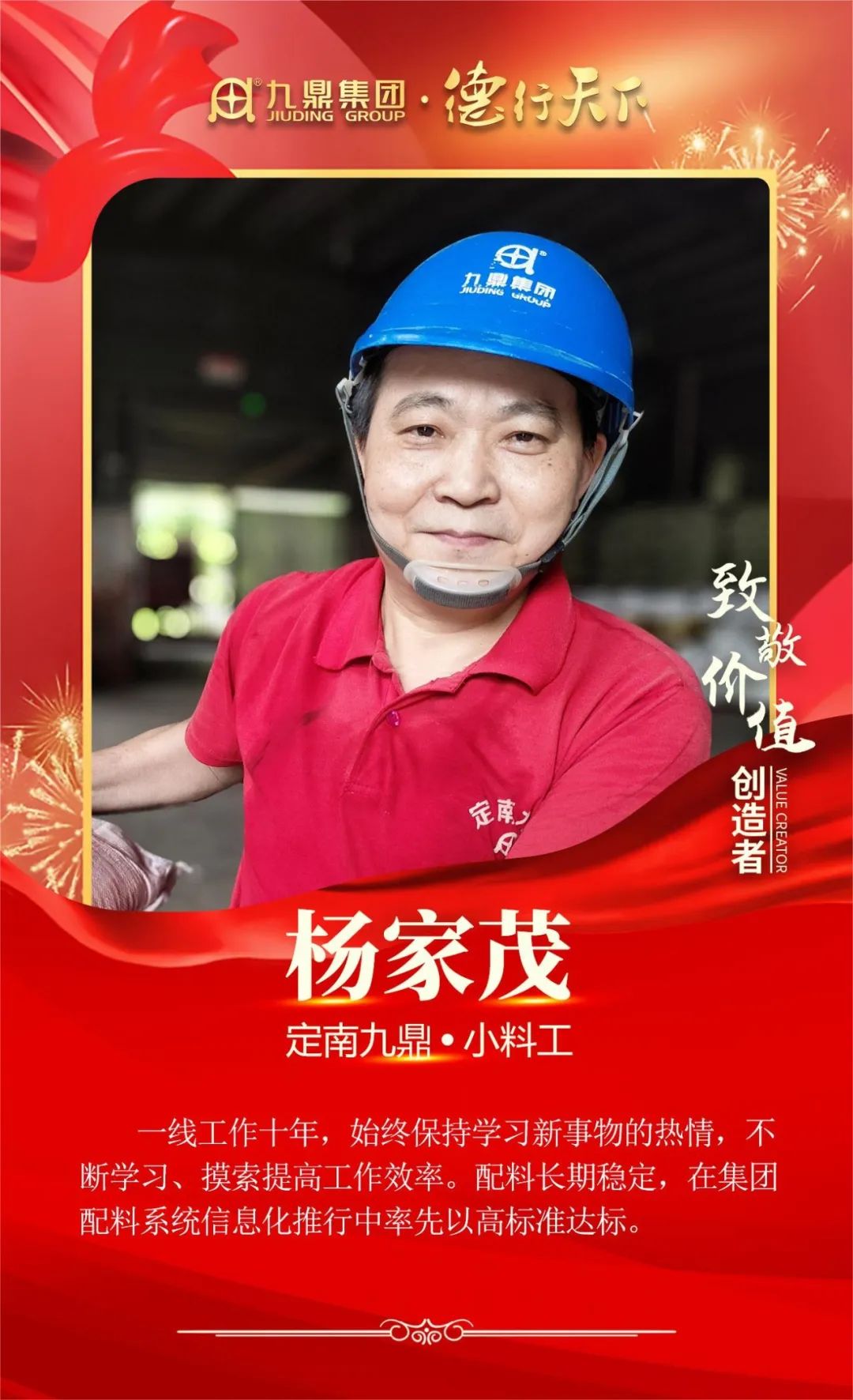 用汗水澆灌收獲,以實(shí)干篤定前行。為大力弘揚(yáng)九鼎文化,鼓舞激勵(lì)廣大九鼎人學(xué)習(xí)標(biāo)桿、趕超先進(jìn),集團(tuán)總部組織開展了“致敬價(jià)值創(chuàng)造者”勞動(dòng)模范評(píng)選。經(jīng)嚴(yán)格篩選考察,授予楊家茂等30名員工2023年度“勞動(dòng)模范”稱號(hào)。
