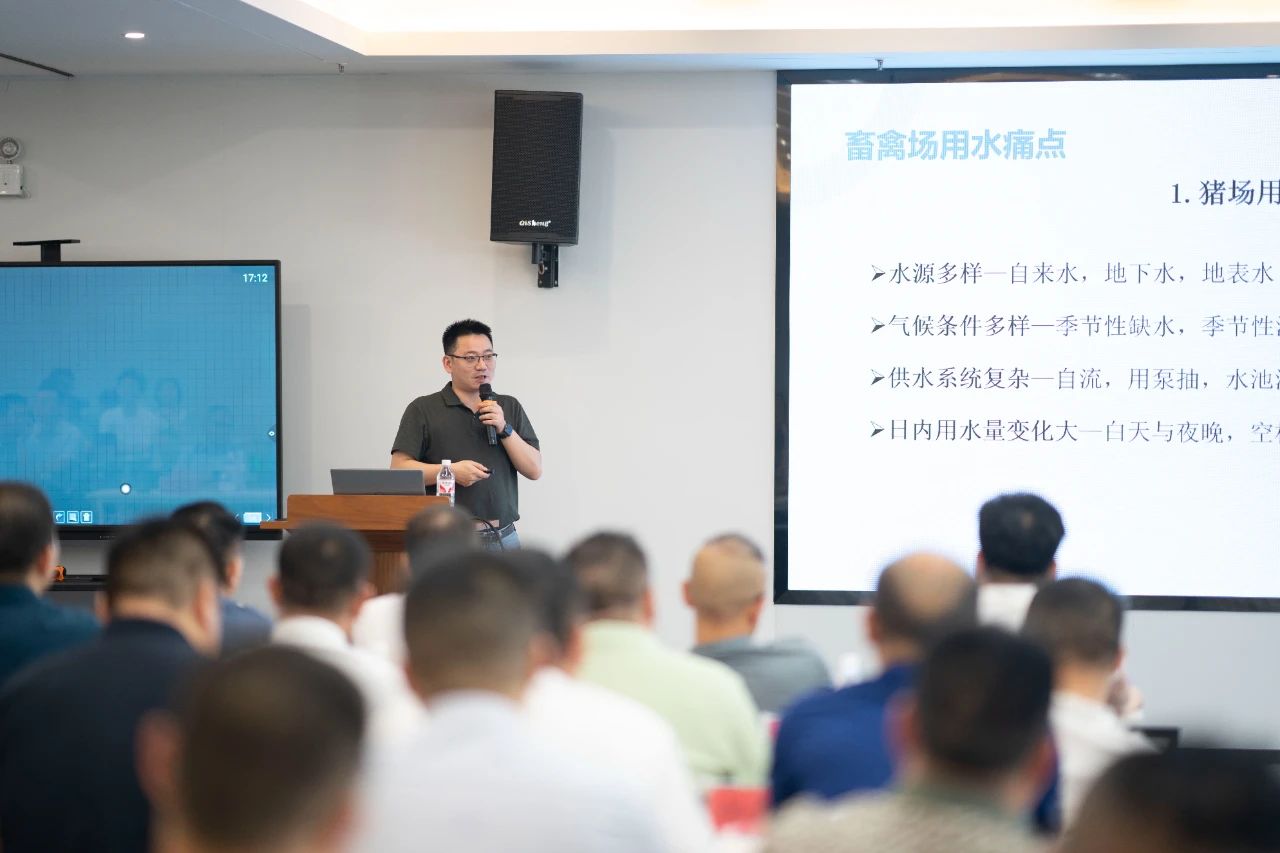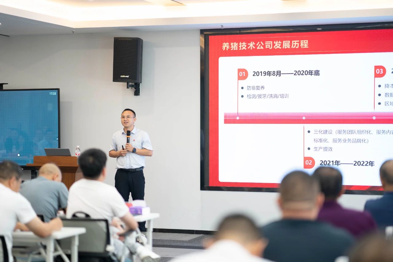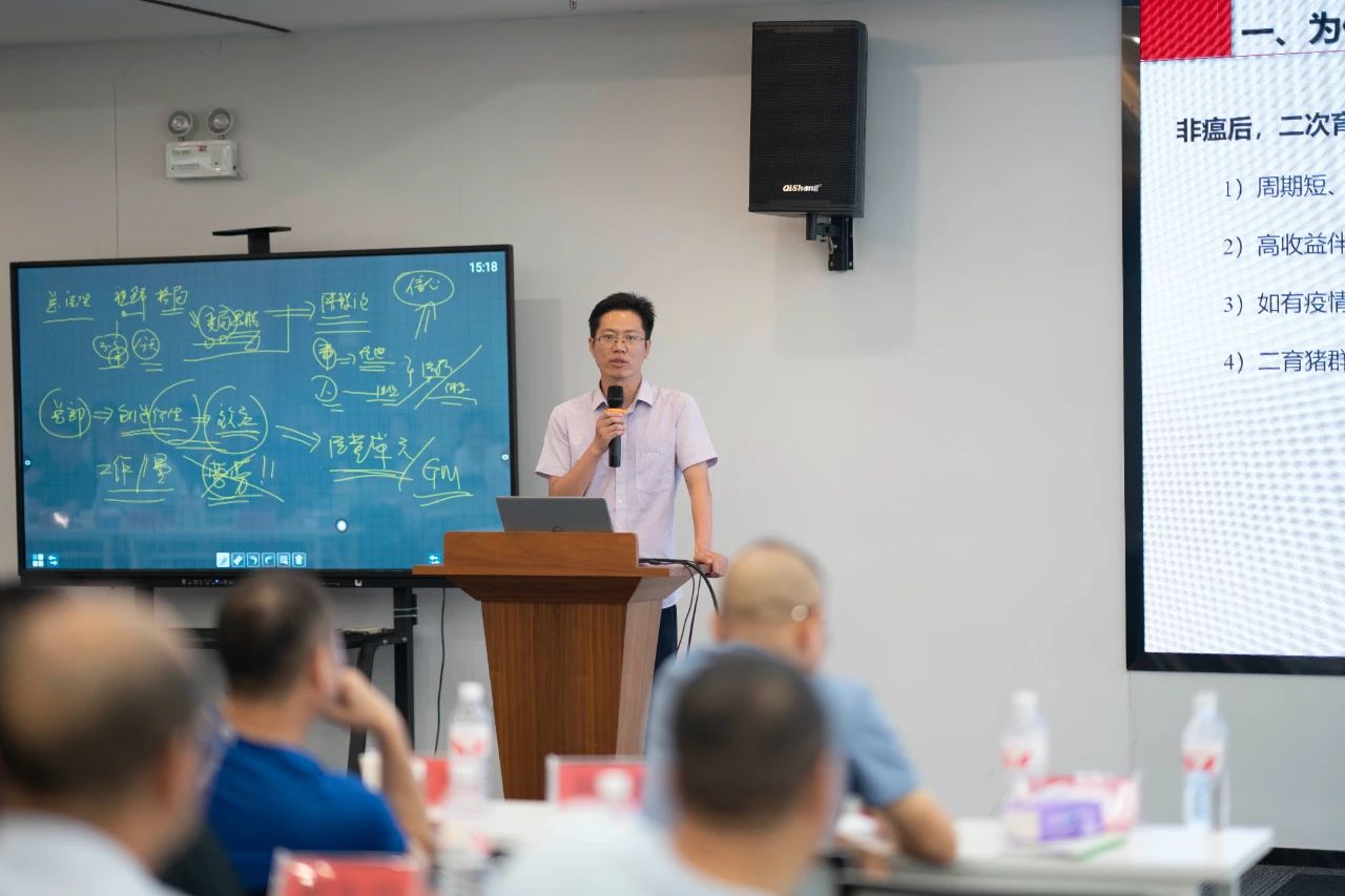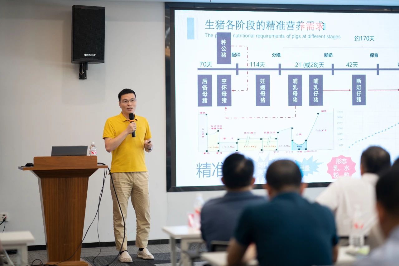 ▲集團(tuán)研發(fā)中心總經(jīng)理江書忠介紹了《家庭農(nóng)場養(yǎng)豬E平臺》和《通過體況管理提升母豬生產(chǎn)成績》