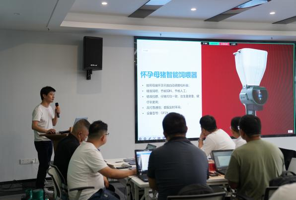 隨后潤農(nóng)羅清經(jīng)理介紹母豬飼喂器、懷孕飼喂器和粥料器等智能飼喂設(shè)備的應(yīng)用場景及價(jià)值點(diǎn),展示飼喂器實(shí)物和講解安裝操作方法。接著至潤農(nóng)展廳進(jìn)行參觀,現(xiàn)場進(jìn)行設(shè)備安裝調(diào)控操作和控制平臺(tái)操作的培訓(xùn),確保每個(gè)服務(wù)老師能講、能裝、能調(diào)試、能維護(hù),為客戶實(shí)現(xiàn)膘體管控+潤農(nóng)飼喂器的“一條龍”服務(wù)。
