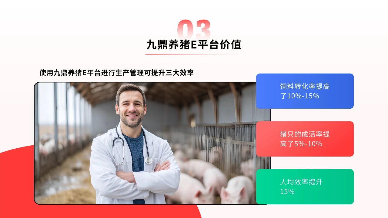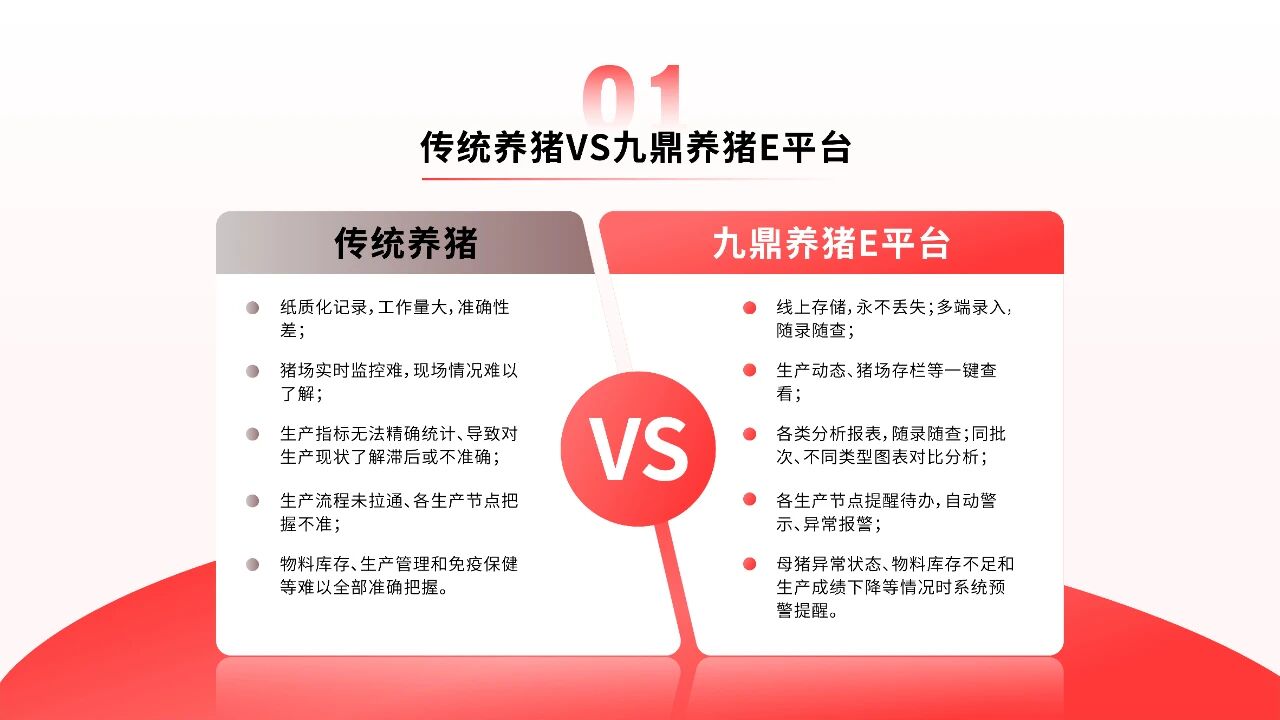 養(yǎng)豬E平臺是九鼎集團(tuán)專為規(guī)模豬場量身打造的專業(yè)數(shù)字化管理軟件。它深刻理解規(guī)模豬場的痛點(diǎn)和需求,通過精細(xì)的數(shù)據(jù)管理,讓養(yǎng)殖從靠經(jīng)驗(yàn)變?yōu)榭繑?shù)據(jù),從而實(shí)現(xiàn)生產(chǎn)過程全程可視、管理決策有據(jù)可依,為豬場決策和生產(chǎn)改良提供基礎(chǔ)和支持,運(yùn)用簡單、實(shí)用、高效的工具提升養(yǎng)殖效益,為生豬產(chǎn)業(yè)高質(zhì)量發(fā)展注入數(shù)字動(dòng)能。